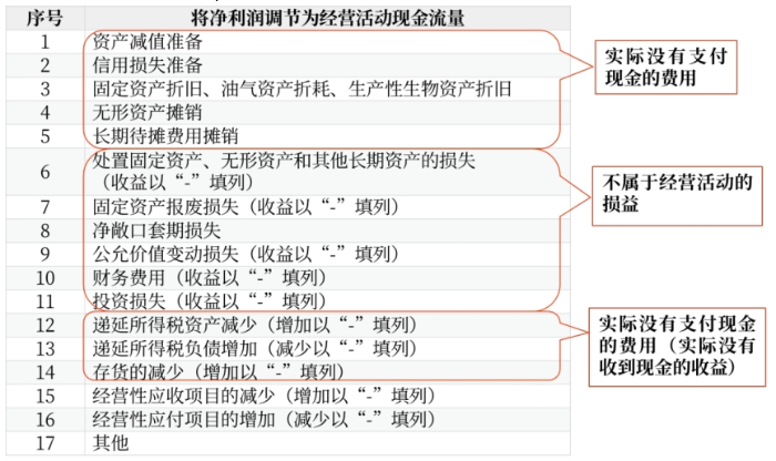 采用間接法將凈利潤調節(jié)為經(jīng)營活動的現(xiàn)金流量凈額時,主要需要調整四大類項目: