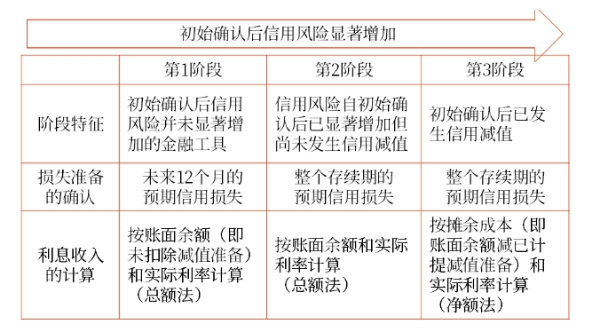 一般情況下,企業(yè)應(yīng)當(dāng)在每個(gè)資產(chǎn)負(fù)債表日評(píng)估相關(guān)金融工具的信用風(fēng)險(xiǎn)自初始確認(rèn)后是否已顯著增加,可以將金融工具發(fā)生信用減值的過(guò)程分為三個(gè)階段,并按照下列情形分別計(jì)量其損失準(zhǔn)備、確認(rèn)預(yù)期信用損失及其變動(dòng)。