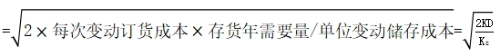 相關(guān)公式 | 存貨年需要量用D來(lái)表示,每次訂貨量用Q來(lái)表示,每次的變動(dòng)訂貨成本用K表示,單位變動(dòng)儲(chǔ)存成本用Kc來(lái)表示,最佳經(jīng)濟(jì)訂貨量用EOQ來(lái)表示 變動(dòng)訂貨成本=訂貨次數(shù)×每次變動(dòng)訂貨成本=D/Q×K 變動(dòng)儲(chǔ)存成本=平均庫(kù)存量×單位變動(dòng)儲(chǔ)存成本=Q/2×Kc 當(dāng)變動(dòng)訂貨成本=變動(dòng)儲(chǔ)存成本時(shí),存貨相關(guān)總成本最小,即:D/Q×K=Q/2×Kc |