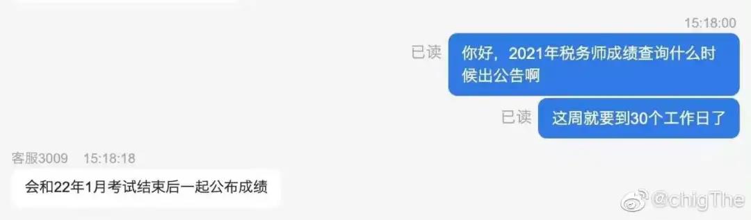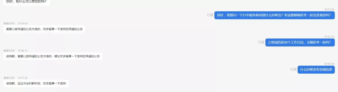 從聊天記錄中我們了解到,雖然最初表示稅務(wù)師考試成績會和延考成績一同下發(fā),但是最后告知考試一切應(yīng)以官方公告為準(zhǔn)。