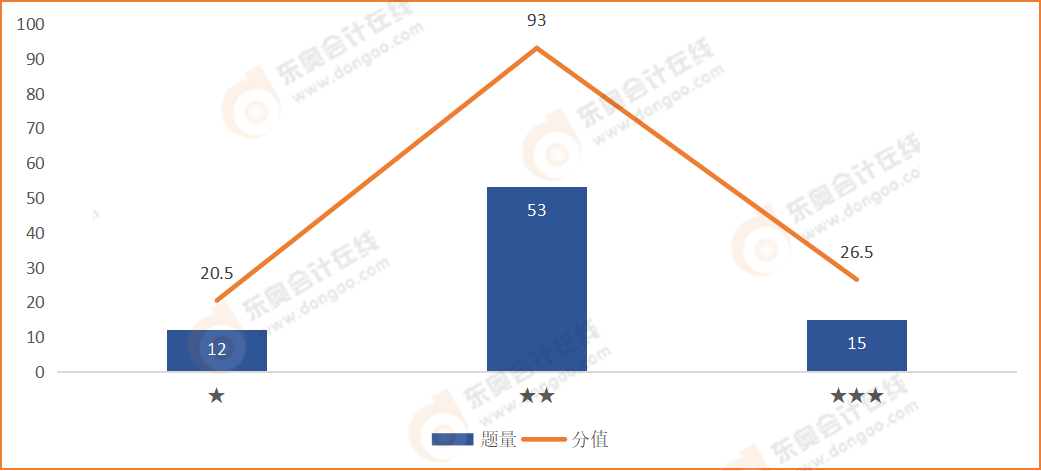 在本次財(cái)務(wù)與會(huì)計(jì)科目的考試中,二星難度的考題占總考題數(shù)量的一半以上,其題量高達(dá)53道,總分值超過(guò)93分!其次是一星難度考題和三星難度考題,兩者題量相差不大,分別為12道和15道。但是相比一星難度考題,三星難度考題所占分值更多,為26.5分,一星難度考題僅占20.5分。