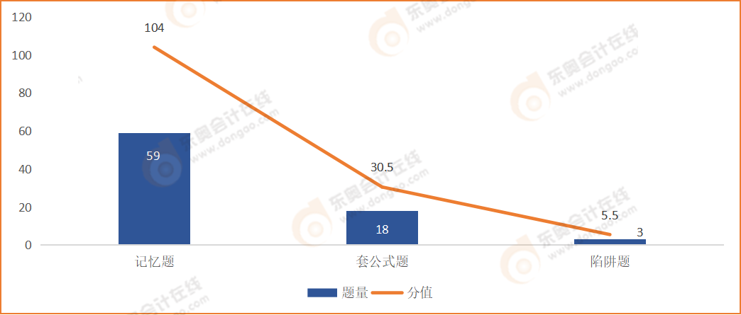 在2021年稅務(wù)師延考財(cái)務(wù)與會(huì)計(jì)科目的考試中,記憶型考題占據(jù)絕大部分比例,超過(guò)了總體量的一半,共有59道題,考查分值超過(guò)了100分,達(dá)到104分。套公式題和陷阱題考查相對(duì)較少,但是與陷阱題相比,套公式考題考查的更多一些,總分值達(dá)到了30.5分。