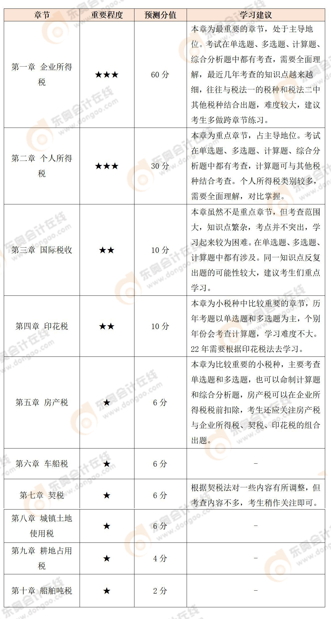 考試教材下發(fā)后,考生就可以正式開始基礎(chǔ)階段的備考學習了,以下為小編根據(jù)2022年《稅法二》彭婷老師雙名師·輕松班次中的基礎(chǔ)班講義,為大家整理的章節(jié)重要程度表格,供大家參考。注:下圖中學習建議內(nèi)容來自東奧教研團隊