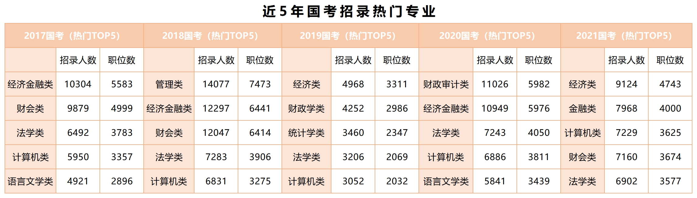 縱觀近5年的公考各專業(yè)崗位招錄人數(shù),不難發(fā)現(xiàn)財(cái)會(huì)、經(jīng)濟(jì)金融類專業(yè)頻頻進(jìn)入前五,已經(jīng)成為招錄的熱門專業(yè)。