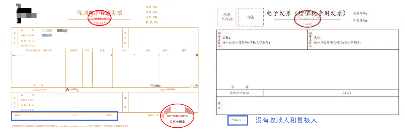 全電發(fā)票沒有收款人和復(fù)核人,所以也不用再糾結(jié)開票人、收款人和復(fù)核人能不能是同一個(gè)人、公司規(guī)模小沒有那么多財(cái)稅員工怎么辦的問題。