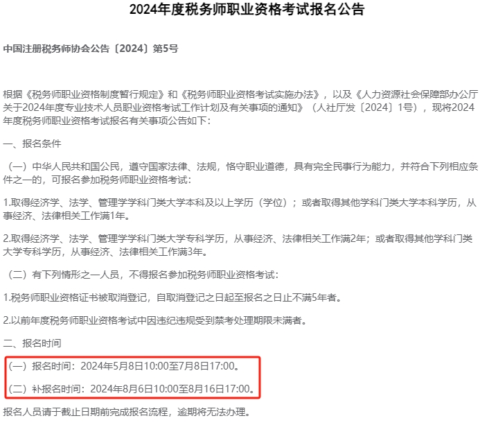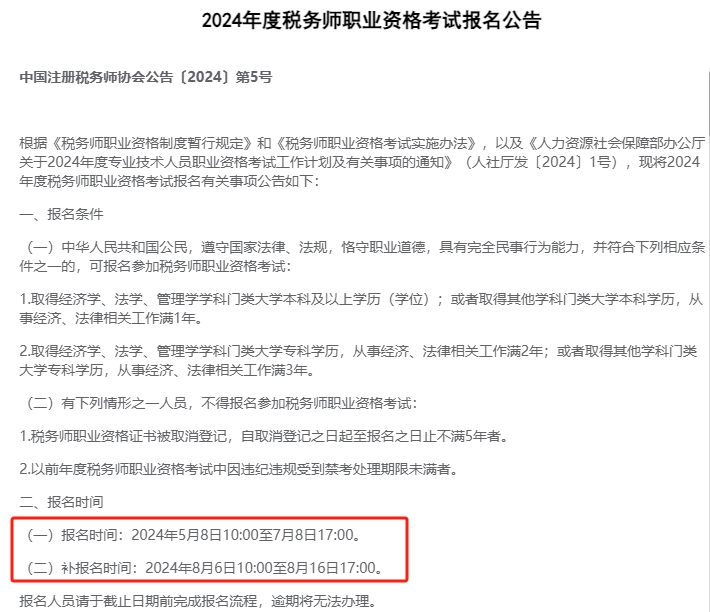 根據(jù)中國(guó)注冊(cè)稅務(wù)師協(xié)會(huì)所公布的2024年度稅務(wù)師職業(yè)資格考試報(bào)名公告》,可得知2024年稅務(wù)師報(bào)名的截止時(shí)間為7817:00。