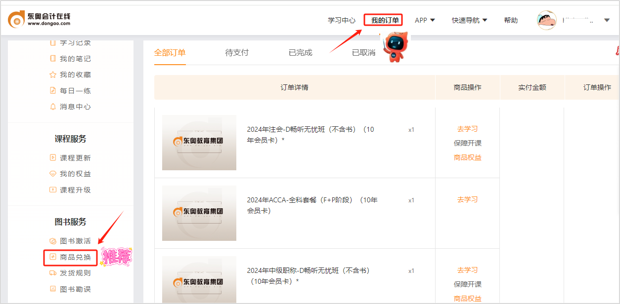 登錄ww.dongao.com→我的訂單→左側(cè)導航欄【圖書服務】中“商品兌換”→選擇圖書→兌換: