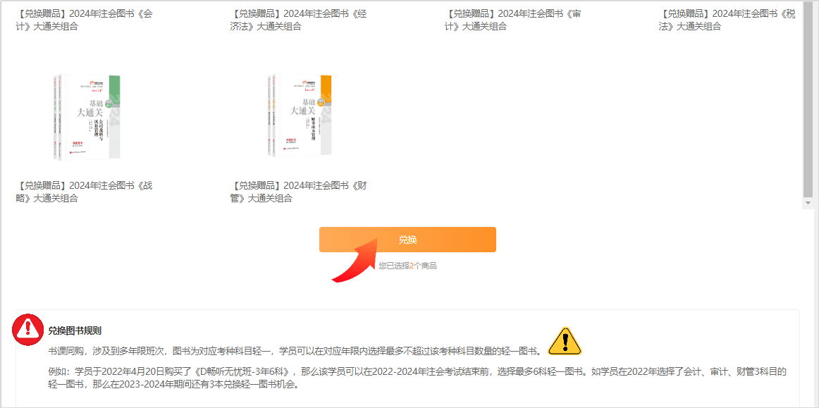 如有多個含書商品,可以點擊切換選擇,同時請您注意各商品的兌換次數(shù),直接點擊您需要兌換的圖書,頁面最底端,點擊“兌換”按鈕即可: