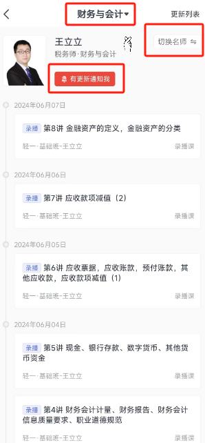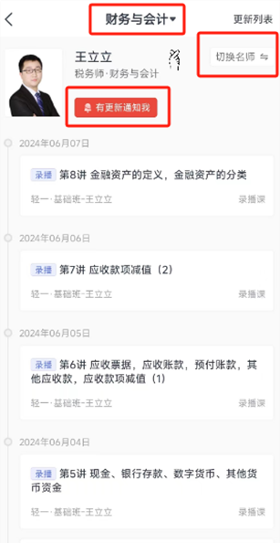 登錄【會計云課堂】APP→右下角“我的”→【我的權(quán)益】中“課程更新”,可以選擇科目、老師查看對應進度,并且可以訂閱更新通知:
