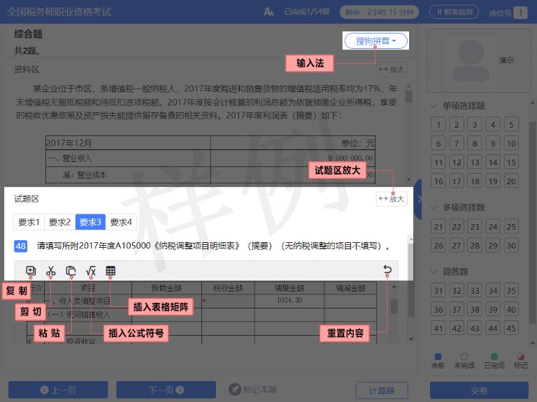 3)主觀題的資料區(qū)以及試題區(qū)的工具欄使用方法可以參考答題輔助功能使用說明。此外,為方便考生作答,答題時使用鍵盤直接輸入數(shù)字或符號,以及使用快捷鍵功能,系統(tǒng)都可接受,作答結(jié)果不受影響。