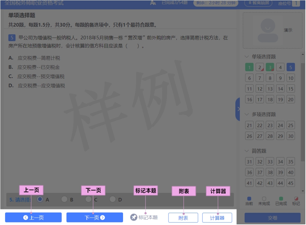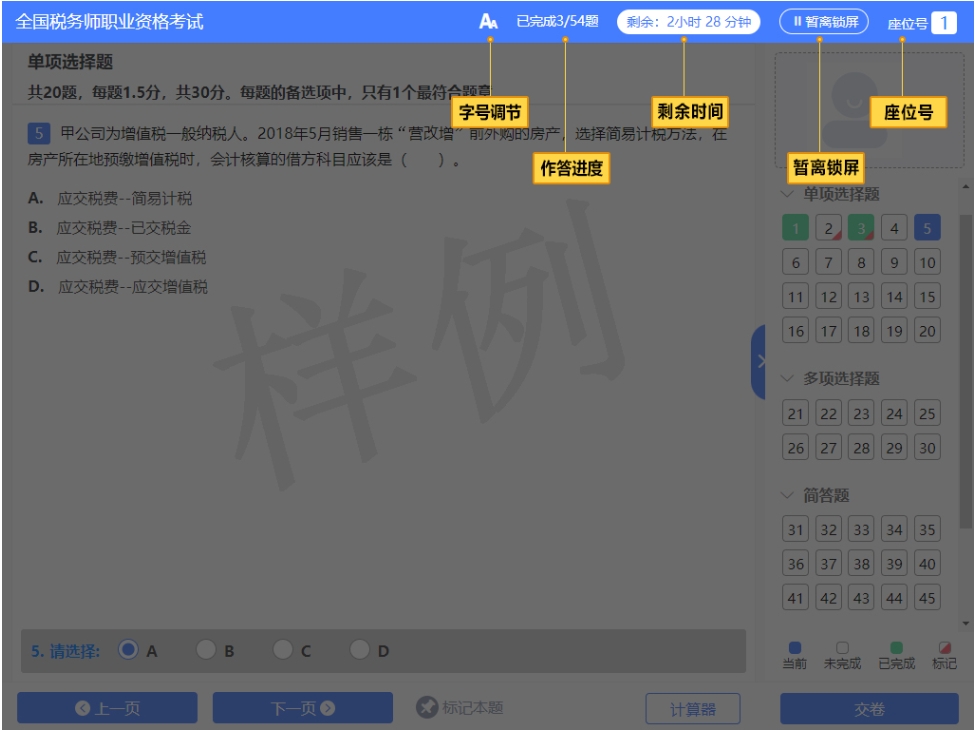 作答進(jìn)度:考生可以查看已答試題的題量和總題量。