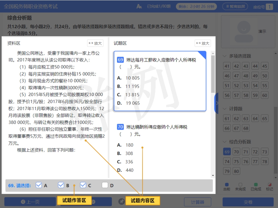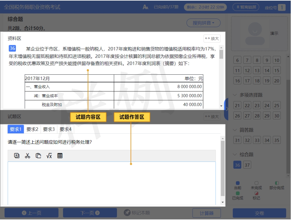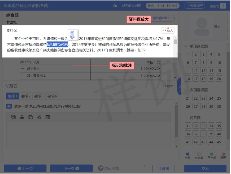 (7)考生對資料區(qū)使用標(biāo)注功能,不會被作為答題結(jié)果,也不會影響考生得分情況。