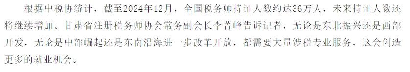 2.提升職業(yè)競爭力:在求職市場上,稅務(wù)師證書已成為進(jìn)入稅務(wù)師事務(wù)所、會(huì)計(jì)師事務(wù)所的“敲門磚”,尤其在跨國企業(yè)、大型國企的稅務(wù)部門,持證人往往能快速晉升至管理層。