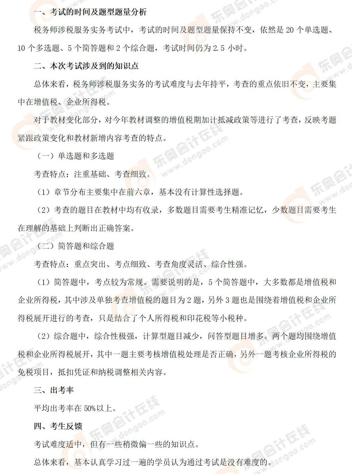稅務(wù)師考試《涉稅服務(wù)實(shí)務(wù)》科目考試已經(jīng)結(jié)束,涉稅服務(wù)實(shí)務(wù)科目一直有著強(qiáng)綜合性的特點(diǎn),今年的考試內(nèi)容難度如何呢?下面是東奧會(huì)計(jì)在線根據(jù)考生反饋整理的《涉稅服務(wù)實(shí)務(wù)》科目考情分析及考點(diǎn)總結(jié),快來看看吧!