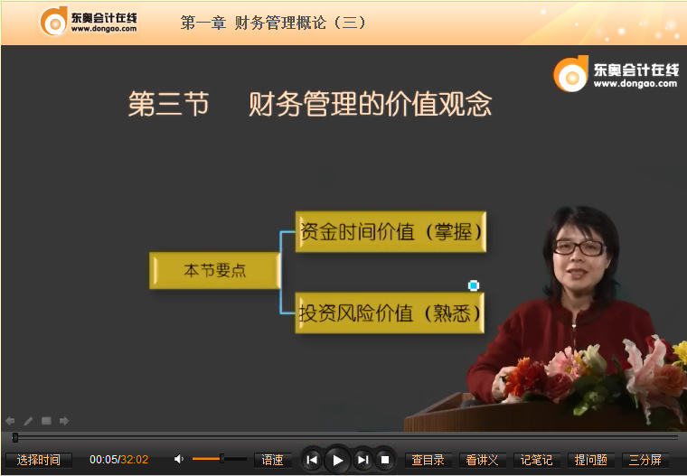 【東奧小編】2013年注稅考試正式進(jìn)入第一輪復(fù)習(xí),現(xiàn)階段是備考高熱時(shí)期,東奧注稅五門(mén)科目基礎(chǔ)班課程現(xiàn)已開(kāi)通,基礎(chǔ)班是最核心的課程,匯聚業(yè)界頂級(jí)名師,每位名師主講自己最擅長(zhǎng)、把握最精準(zhǔn)的課程。讓考生一步一個(gè)腳印牢牢掌握每一個(gè)考點(diǎn)。以下是東奧名師閆華紅2013注稅免費(fèi)課件:《財(cái)務(wù)與會(huì)計(jì)》之財(cái)務(wù)管理的價(jià)值觀念講解: