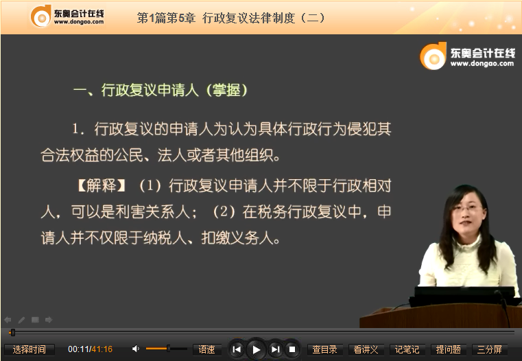 以下是東奧名師黃潔洵2013年注冊稅務師考試基礎班免費課件:《稅收相關法律》之行政復議參加人試聽課程: