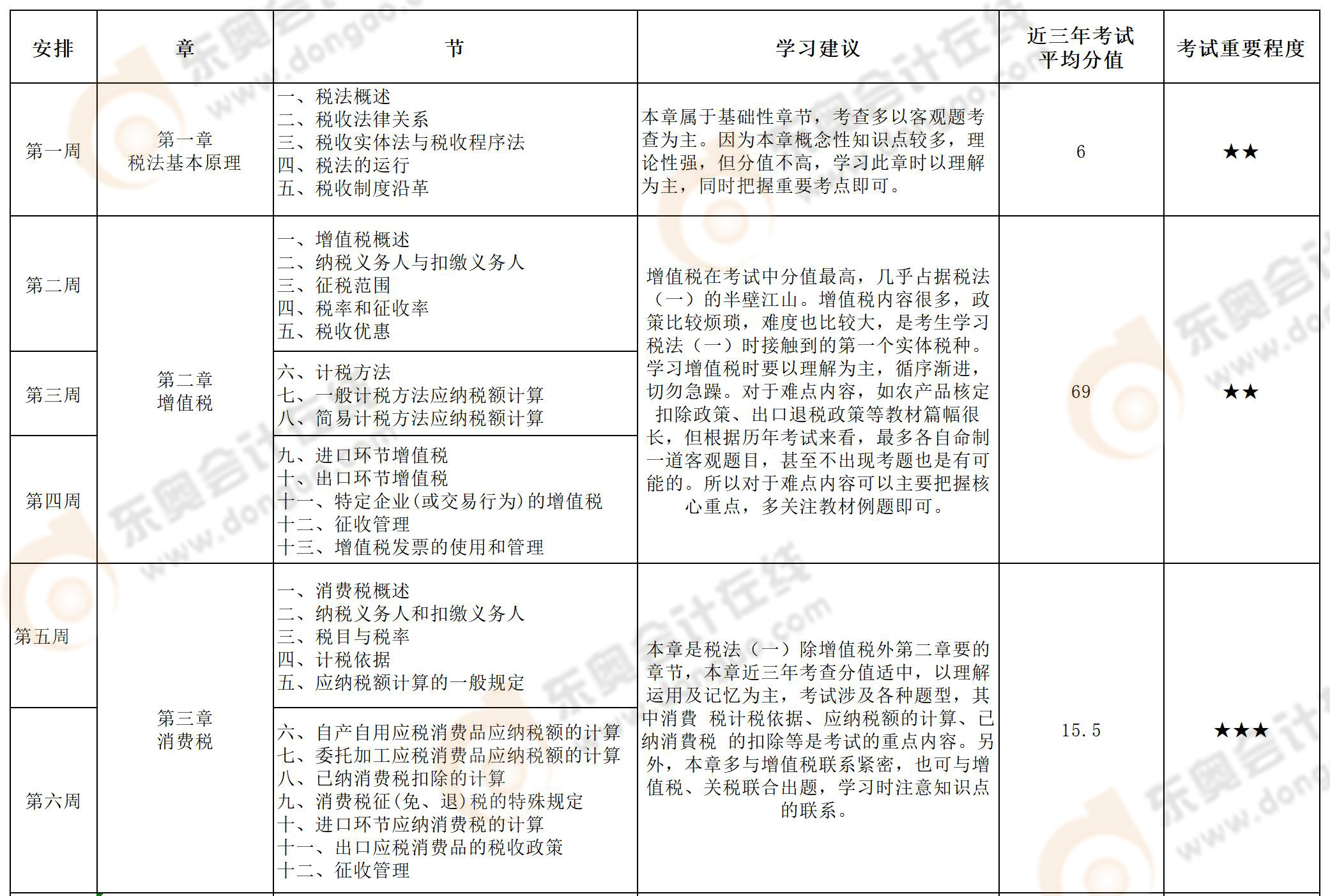 針對重點(diǎn)內(nèi)容進(jìn)行著重學(xué)習(xí)。增值稅、資源稅、土地增值稅和消費(fèi)稅所占分值較大,是考試重難點(diǎn),考生們要重點(diǎn)復(fù)習(xí),熟練掌握。