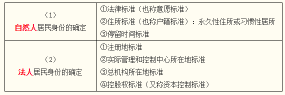 (二)約束稅收管轄權(quán)的國(guó)際慣例 | 1.約束居民管轄權(quán)的國(guó)際慣例 (1)自然人居民身份的確定 (2)法人居民身份的確定 |