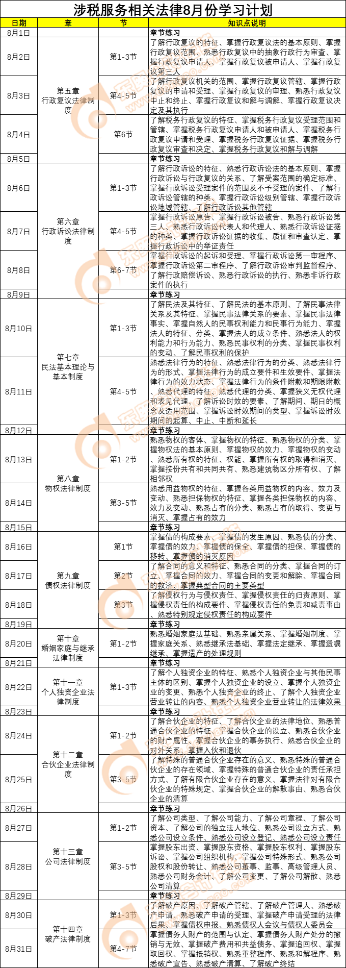 分享!2021年稅務(wù)師《涉稅服務(wù)相關(guān)法律》8月份每日學(xué)習(xí)計(jì)劃!