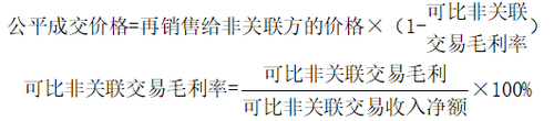 (1)再銷售價格法以關聯(lián)方購進商品再銷售給非關聯(lián)方的價格減去可比非關聯(lián)交易毛利后的金額作為關聯(lián)方購進商品的公平成交價格。其計算公式為: