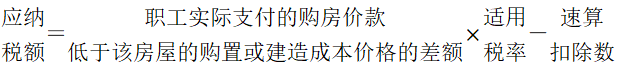 2.除上述規(guī)定情形外,單位按低于購(gòu)置或建造成本價(jià)格出售住房給職工,職工因此而少支出的差價(jià)部分,不并入當(dāng)年綜合所得,以差價(jià)收入除以12個(gè)月得到的數(shù)額,按照月度稅率表確定適用稅率和速算扣除數(shù),單獨(dú)計(jì)算納稅。計(jì)算公式為: