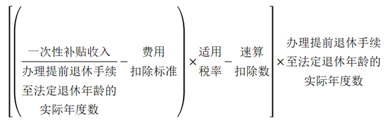 2.個(gè)人辦理提前退休手續(xù)而取得的一次性補(bǔ)貼收入,應(yīng)按照辦理提前退休手續(xù)至法定離退休年齡之間實(shí)際年度數(shù)平均分?jǐn)?,確定適用稅率和速算扣除數(shù),單獨(dú)適用綜合所得稅率表(稅率表一),計(jì)算納稅。計(jì)算公式: