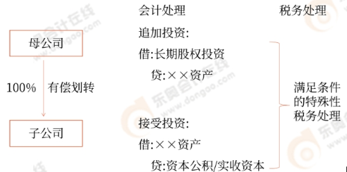 1.100%直接控制的母子公司之間,母公司向子公司按賬面凈值劃轉(zhuǎn)其持有的股權(quán)或資產(chǎn),母公司獲得子公司100%的股權(quán)支付。母公司按增加長期股權(quán)投資處理,子公司按接受投資(包括資本公積,下同)處理。母公司獲得子公司股權(quán)的計稅基礎(chǔ)以劃轉(zhuǎn)股權(quán)或資產(chǎn)的原計稅基礎(chǔ)確定。(順流有償)