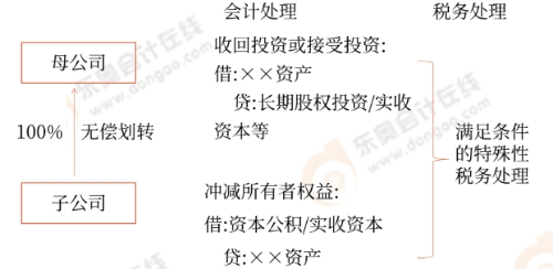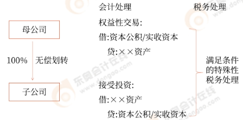 2.100%直接控制的母子公司之間,母公司向子公司按賬面凈值劃轉(zhuǎn)其持有的股權(quán)或資產(chǎn),母公司沒有獲得任何股權(quán)或非股權(quán)支付。母公司按沖減實收資本(包括資本公積,下同)處理,子公司按接受投資處理。(順流無償)