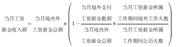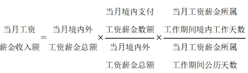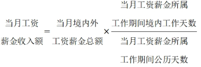 在一個(gè)納稅年度內(nèi),在境內(nèi)累計(jì)居住不超過90天的非居民個(gè)人,僅就歸屬于境內(nèi)工作期間并由境內(nèi)雇主支付或者負(fù)擔(dān)的工資薪金所得計(jì)算繳納個(gè)人所得稅。當(dāng)月工資薪金收入額的計(jì)算公式如下(公式一):
