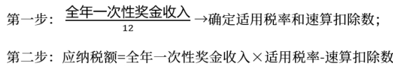 1.居民個人取得全年一次性獎金,在2027年12月31日前,可選擇不并入當年綜合所得,以全年一次性獎金收入除以12個月得到的數(shù)額,按照按月?lián)Q算后的綜合所得稅率表(簡稱“月度稅率表”,即“稅率表三”),確定適用稅率和速算扣除數(shù),單獨計算納稅。計算過程為: