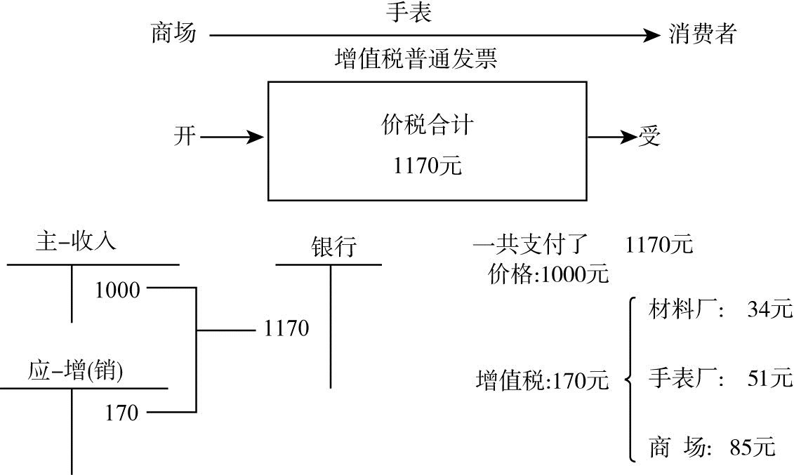 由于購買手表時,已經(jīng)支付了廠家85元的增值稅,要抵償?shù),還要交85元(170-85)的增值稅,即收了消費者170元的增值稅補償上一環(huán)節(jié)支付的增值稅85元后,將剩余的85元交給稅務(wù)機關(guān)。