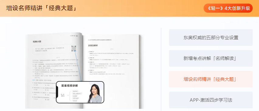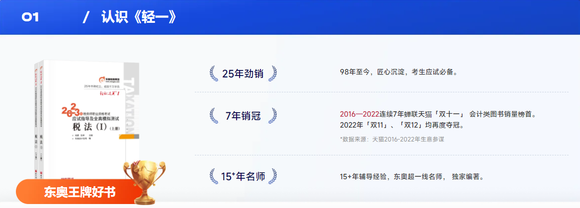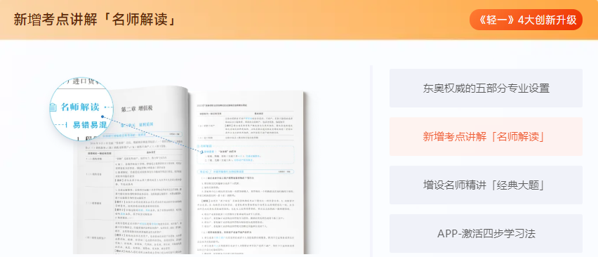 以《稅法一》為例,《輕一》中共含有186個考點精析、383個經(jīng)典例題、35個大題精練、140+個盲點、坑點提示。更有東奧引以為傲的五部分專業(yè)設(shè)置等超多升級,幫助考生更好的進(jìn)行備考。>>>點擊了解輕松過關(guān)系列圖書<<<