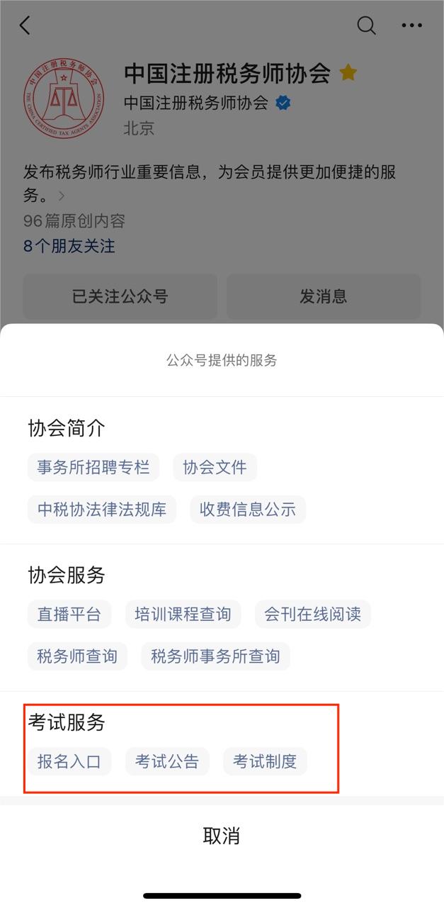 2、進(jìn)入中國(guó)注冊(cè)稅務(wù)師協(xié)會(huì)微信公眾號(hào),點(diǎn)擊考試服務(wù)中的“報(bào)名入口”。