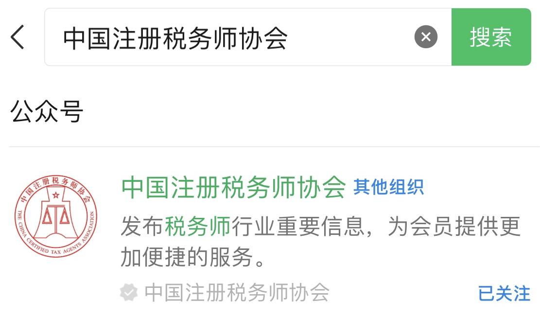 1、微信搜索“中國(guó)注冊(cè)稅務(wù)師協(xié)會(huì)”官方微信公眾號(hào),點(diǎn)擊關(guān)注。