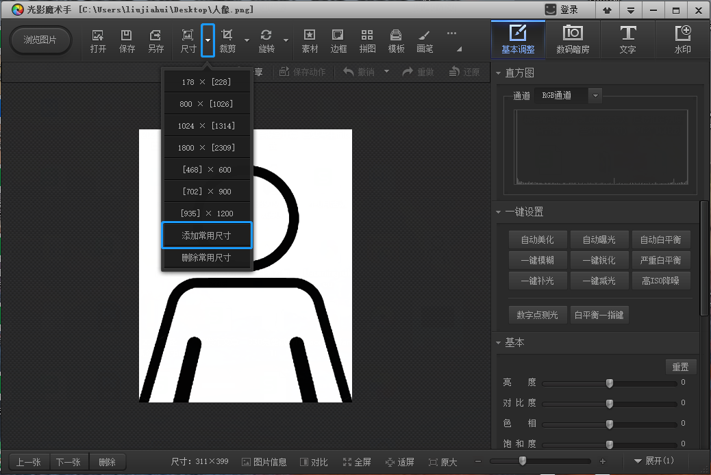 第三步:點(diǎn)擊“裁剪”旁下拉標(biāo)志,點(diǎn)擊“添加常用比例”,輸入“178*220”,點(diǎn)擊確定后,再次展開裁剪旁選下拉標(biāo)注,找到新添加比例并點(diǎn)擊,將圖片修改為178*220大小。點(diǎn)擊圖片,查看大圖。