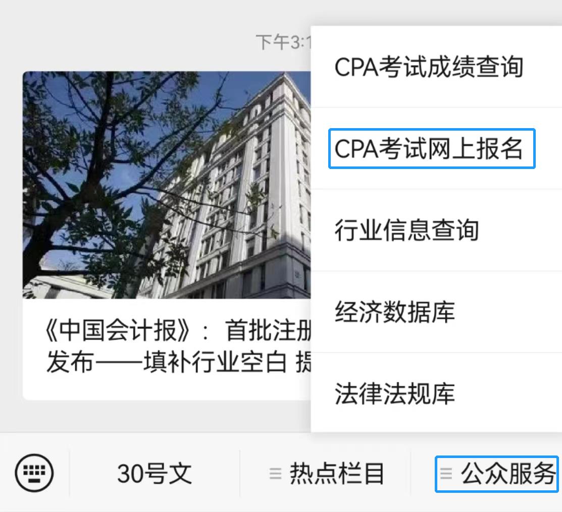 第一步:關(guān)注中注協(xié)官方微信公眾號(hào)“中國注冊(cè)會(huì)計(jì)師協(xié)會(huì)”,點(diǎn)擊“公眾服務(wù)”,選擇“CPA考試網(wǎng)上報(bào)名”