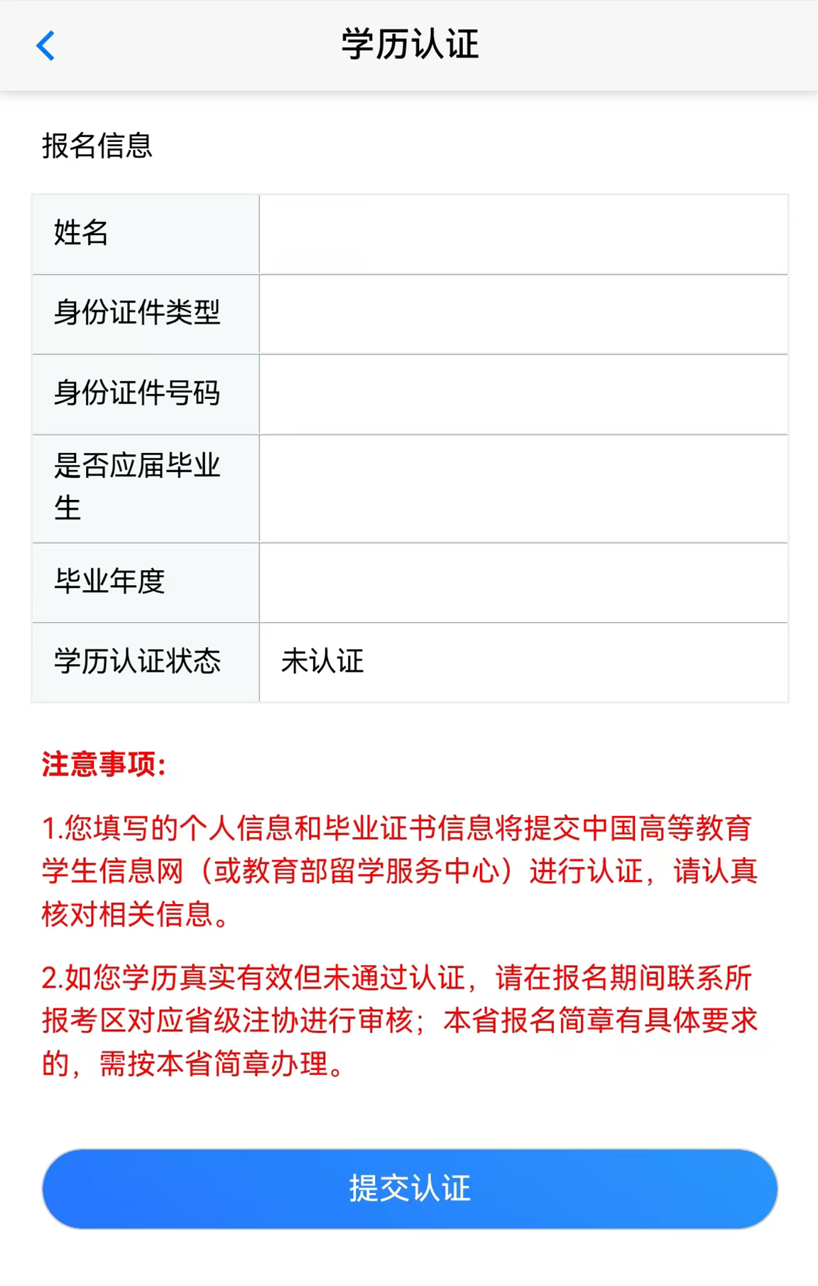首次報(bào)名人員的學(xué)歷信息認(rèn)證,原則上由網(wǎng)報(bào)系統(tǒng)根據(jù)身份證件信息鏈接“中國高等教育學(xué)生信息網(wǎng)”進(jìn)行。持國(境)外學(xué)歷的報(bào)名人員(含港澳臺(tái)居民居住證持有人)填報(bào)的教育部留學(xué)服務(wù)中心出具的學(xué)歷認(rèn)證書編號(hào),由中注協(xié)、省級(jí)注協(xié)提交教育部留學(xué)服務(wù)中心進(jìn)行認(rèn)證。