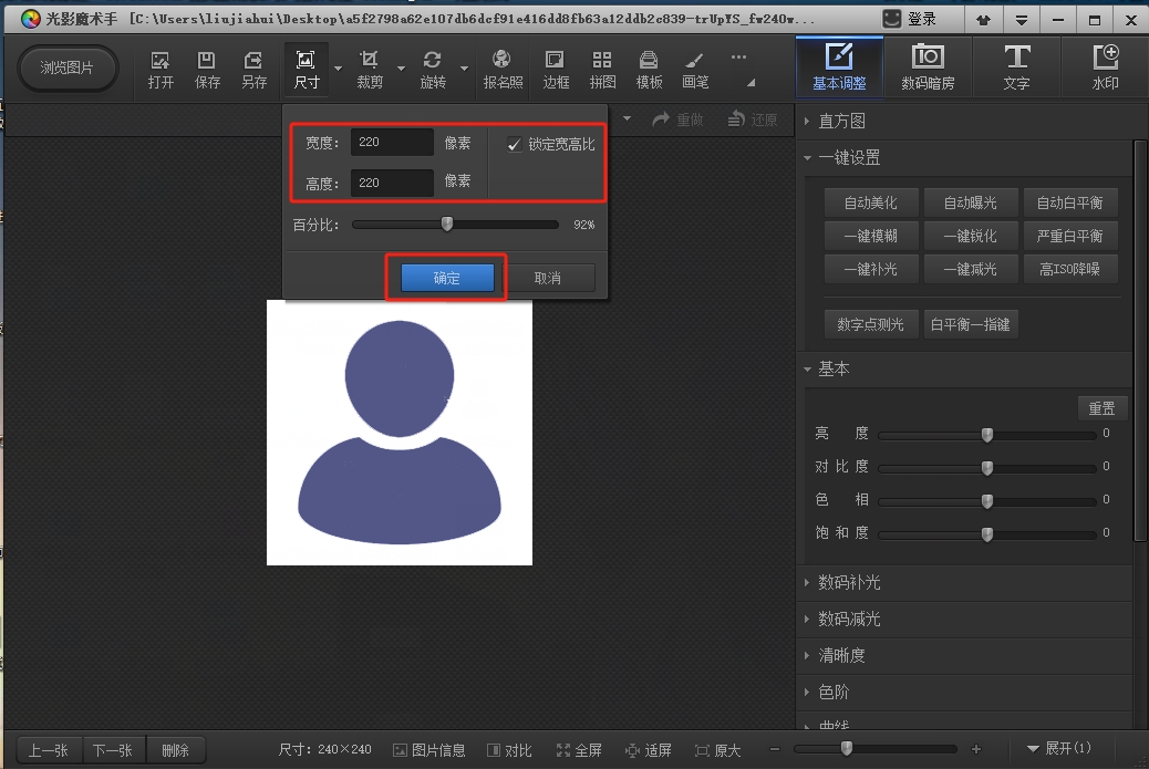 第二步:尺寸調(diào)整。點(diǎn)擊“尺寸”按鈕,調(diào)節(jié)圖片尺寸,在“高度”欄輸入220,“寬度”欄無需設(shè)置自動同比調(diào)整。