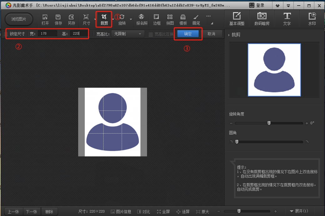第三步:裁剪圖片。點(diǎn)擊“裁剪”按鈕,下方彈出尺寸設(shè)置,寬輸入178,高輸入220,點(diǎn)擊“確定”即可得到178像素×220像素的圖片。