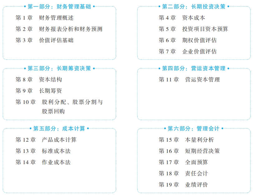 作為注會(huì)考試重要組成內(nèi)容之一的《財(cái)務(wù)成本管理》這門課程包括三部分內(nèi)容,第一部分是財(cái)務(wù)管理(第1~11章),第二部分是成本計(jì)算(第12~14章),第三部分是管理會(huì)計(jì)(第15~19章)。全書共19章,可細(xì)分為6個(gè)部分,總覽如下。