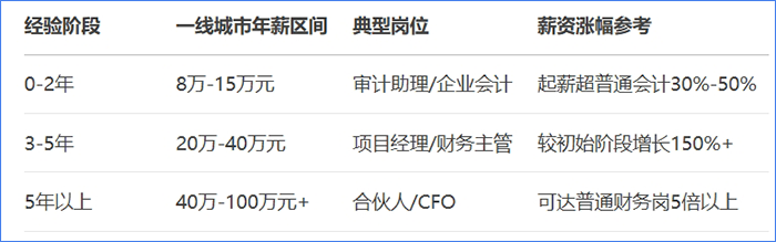 一線城市資深從業(yè)者年薪普遍突破40萬元,四大會(huì)計(jì)師事務(wù)所合伙人年薪超百萬,投行、券商等金融機(jī)構(gòu)的財(cái)務(wù)高管年薪可達(dá)80萬至150萬元。即便在二三線城市,持證人薪資也顯著高于普通會(huì)計(jì)崗位,且晉升速度更快。