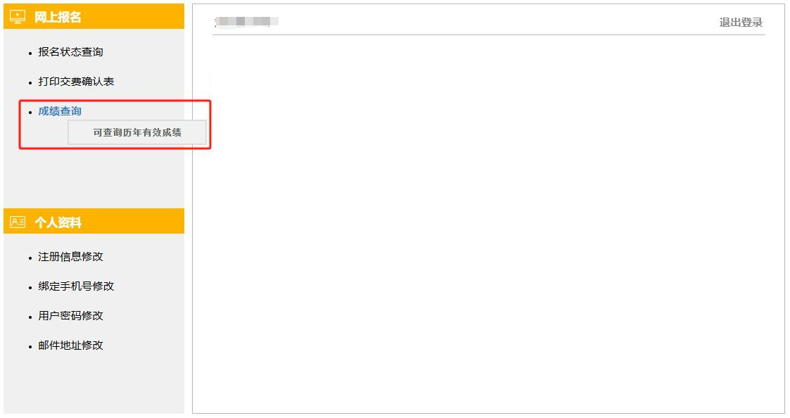 第2步:登錄成功后,點(diǎn)擊左側(cè)“成績查詢”按鈕,網(wǎng)報系統(tǒng)提示,考生也可在此查詢歷年有效成績。