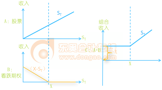 股票加看跌期權(quán)組合,稱為保護性看跌期權(quán)。是指購買1份股票,同時購買該股票1份看跌期權(quán)。