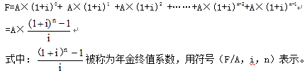 其中的(1+i)n被稱為復(fù)利終值系數(shù)或1元的復(fù)利終值,用符號(F/P,i,n)表示。