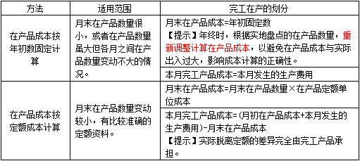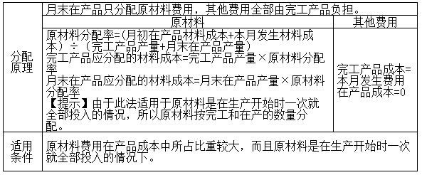 【提示】公式前兩項(xiàng)之和為待分配費(fèi)用,待分配費(fèi)用在完工產(chǎn)品與月末在產(chǎn)品之間分配有兩類(lèi)方法:一是“倒擠法”,即先確定月末在產(chǎn)品成本,再用待分配費(fèi)用減月末在產(chǎn)品成本得出完工產(chǎn)品的成本;二是“分配法”,即將待分配費(fèi)用按一定比例在完工產(chǎn)品與月末在產(chǎn)品之間進(jìn)行分配。