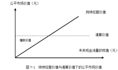 (1)一個企業(yè)的公平市場價值,應(yīng)當(dāng)是持續(xù)經(jīng)營價值與清算價值中較高的一個。