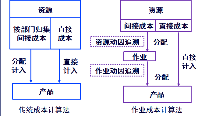 作業(yè)成本法的基本指導思想是,“作業(yè)消耗資源、產(chǎn)品(服務或顧客)消耗作業(yè)”。根據(jù)這一指導思想,作業(yè)成本法把成本計算過程劃分為兩個階段。 作業(yè)成本法下,間接成本的分配路徑是: “資源→作業(yè)→產(chǎn)品”; 傳統(tǒng)成本計算方法下,間接成本的分配路徑是: “資源→部門→產(chǎn)品”。 |
