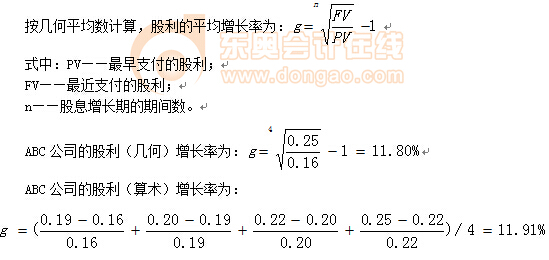 【提示】幾何增長(zhǎng)率適合投資者在整個(gè)期間長(zhǎng)期持有股票的情況,而算術(shù)平均數(shù)適合在某一段時(shí)間持有股票的情況。由于股利折現(xiàn)模型的增長(zhǎng)率,需要長(zhǎng)期的平均增長(zhǎng)率,幾何增長(zhǎng)率更符合邏輯。