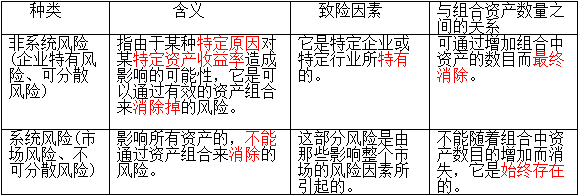 【提示1】可以通過增加組合中資產(chǎn)的數(shù)目而最終消除的風險被稱為非系統(tǒng)風險,而那些反映資產(chǎn)之間相互關系,共同運動,無法最終消除的風險被稱為系統(tǒng)風險。