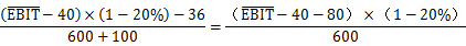 無差別點(diǎn)的EBIT=(800×120-600×60)/(800-600)=300(萬元)